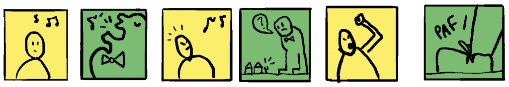 - Vous raconterez vos histoires en 6 cases. C’est une contrainte formelle importante pour le confort de lecture sur le site, les cases s’affichant en une, deux ou trois colonnes, et je privilégie les temps de lecture courts sur internet. Les images seront de préférence au format carré, pourquoi pas en format portrait, évitez par contre les formats paysages qui vont s’afficher trop petites sur deux colonnes.
